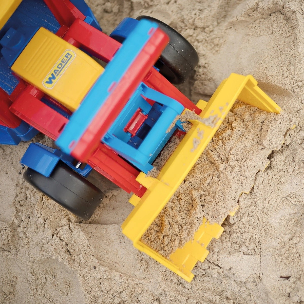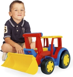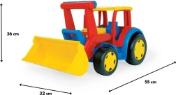 Gigant Traktor z Łopatą o długości 60 cm to masywna zabawka o realistycznym wyglądzie, która sprawdzi się jako doskonałe narzędzie do budowania, nabierania i przenoszenia.