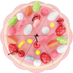 Ten tort jest wykonany z wysokiej jakości drewna, które jest bezpieczne dla dzieci i oferuje ponadczasowe piękno oraz trwałość. Części tortu są połączone magnesami, co pozwala dzieciom „kroić” tort i serwować go na dołączonych talerzach i przy pomocy sztućców.