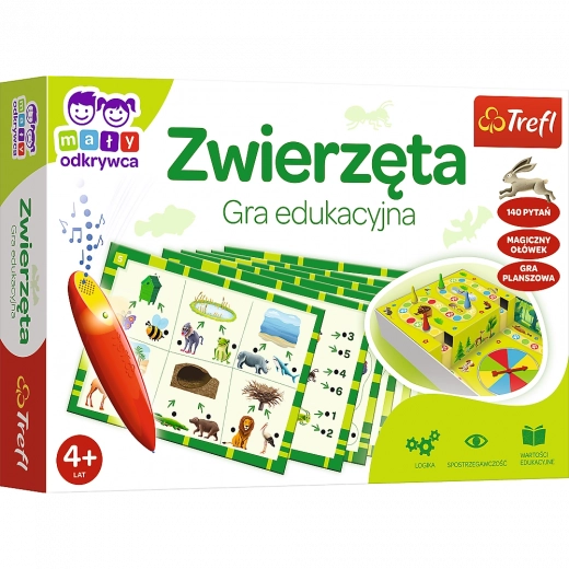 Gra Zwierzęta Magiczny ołówek Trefl pomaga dzieciom odkrywać świat zwierząt w interaktywny sposób. Dzięki sprytnej pomocy – „magicznemu” ołówkowi – dzieci otrzymują natychmiastową informację zwrotną, co wspiera samodzielność i naukę poprzez zabawę.