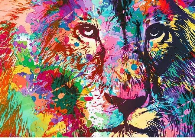 - Motyw: Kolorowy lew – wyrazista, nowoczesna ilustracja pełna barw.