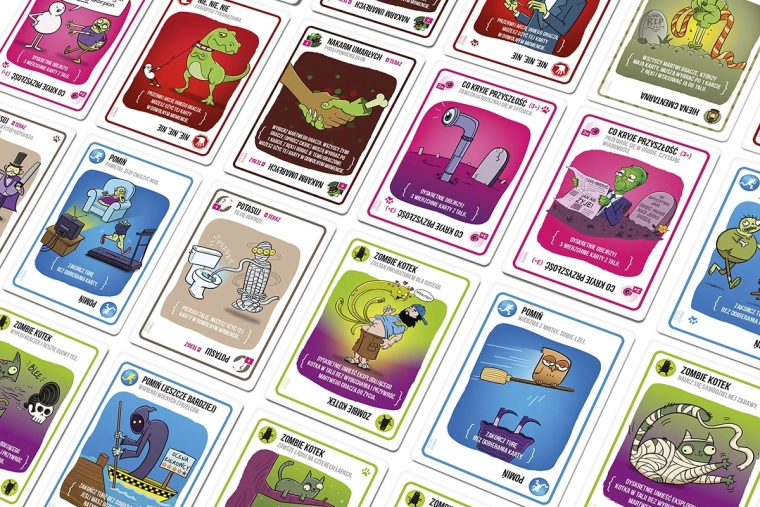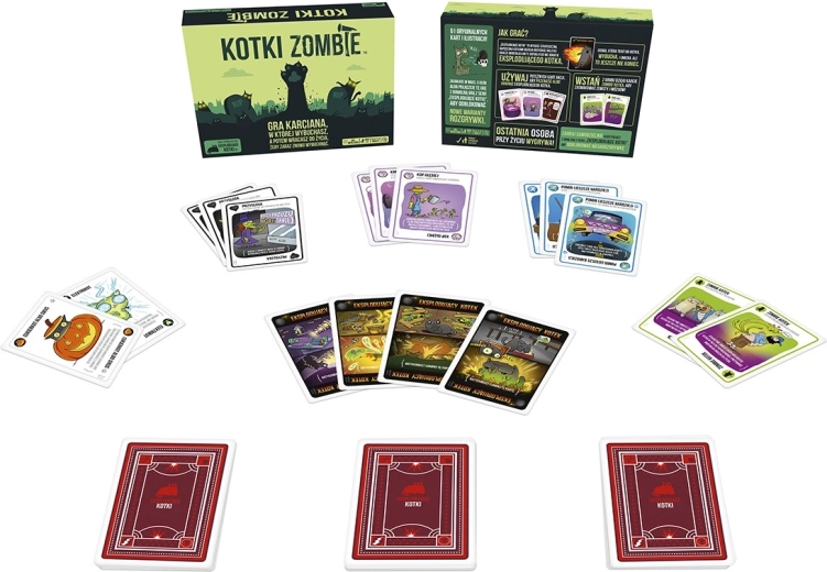 Wybuchające koty: Zombies to samodzielna talia 61 kart z zupełnie nowymi ilustracjami nawiązującymi do klimatu horroru. Część mechanik znasz z gry podstawowej, ale znajdziesz tu też całkiem nowe efekty z zombie kotami na czele, które pozwolą ci pozostać w grze nawet po spotkaniu z wybuchającym kotem.