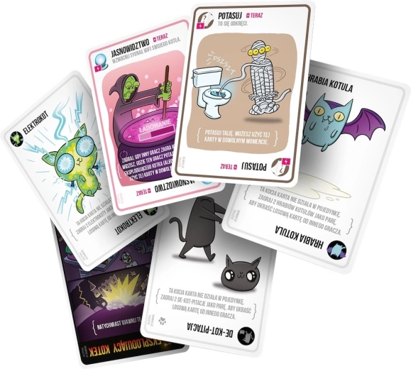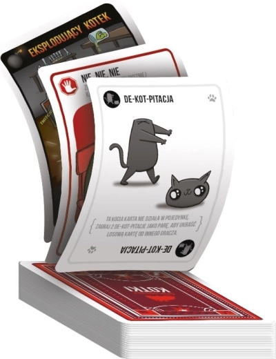 Exploding Kittens to kocia, całkowicie bezpieczna wersja rosyjskiej ruletki. Podczas rozgrywki gracze w każdej turze dobierają jedną kartę, aż ktoś trafi na wybuchające kocię — pechowiec eksploduje i odpada z gry, co kończy jego udział. Na szczęście w talii są też karty, dzięki którym można nieuniknione opóźnić (albo najlepiej — zrzucić na przeciwnika). Aby wygrać, trzeba rozsądnie gospodarować posiadanymi kartami.