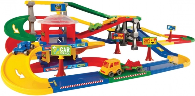 Ten kompleks parkingowy z serii Play Tracks Garage ma lekką konstrukcję, która umożliwia układanie torów w różnych kształtach, urozmaicając zabawę dziecka. Zestaw zawiera dwupoziomowy parking oraz tor o długości jedenastu metrów.