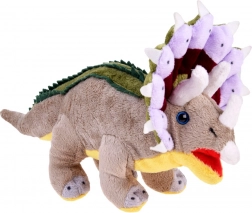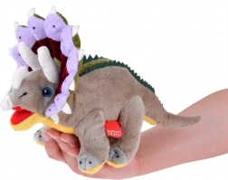 Ten pluszowy dinozaur to wierna replika Triceratopsa z charakterystycznymi rogami i wyrazistymi niebieskimi oczami.