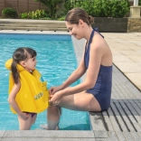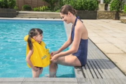 Dzięki regulowanym klamrom i solidnemu trzymaniu kamizelka jest bezpieczna i wygodna. Pomaga dzieciom utrzymać głowę nad wodą.
