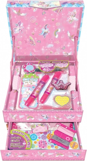 Ten designerski zestaw jest idealny dla dzieci i kreatywnych dusz, które uwielbiają pisać tajne wiadomości, ozdabiać zeszyty i tworzyć oryginalne dodatki. Eleganckie kartonowe pudełko z dekoracją i magnetycznym zapięciem to także praktyczny organizer – po otwarciu wysuwają się dwie szufladki, w których przechowasz całe akcesoria i drobiazgi.