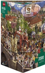 Puzzle od niemieckiego duetu artystów Doro Göbela i Petera Knorra są wyzwaniem dla każdego miłośnika układania. Zawiera 2000 elementów, które po złożeniu tworzą kreskówkowy obraz cyrkowej parady na Moście Karola w Pradze.