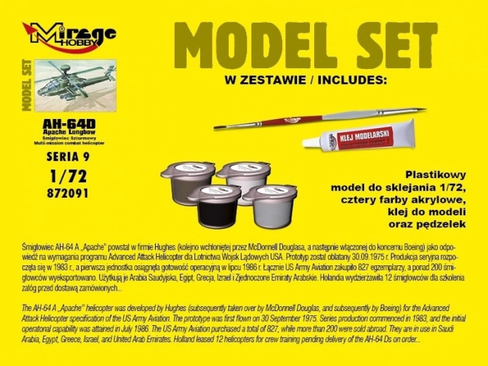 Zbuduj legendarny AH-64D Apache Longbow w skali 1:72. Kompletny zestaw dla początkujących i zaawansowanych modelarzy zawiera model plastikowy, 4 farby akrylowe, klej oraz pędzelek. Świetny wybór dla fanów nowoczesnej techniki wojskowej od 14 lat.