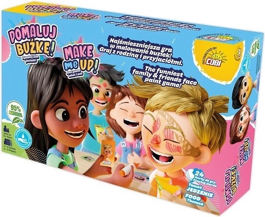Zestaw zawiera 12 naturalnych kredek do malowania twarzy, klepsydrę, notes z tabelą wyników, 24 karty do gry: motywy jedzenia.