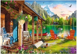- Piękny motyw domku w górach z jeziorem dla przyjemnej atmosfery podczas układania.