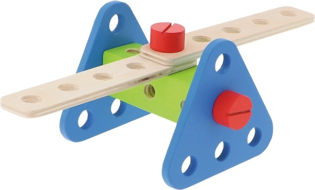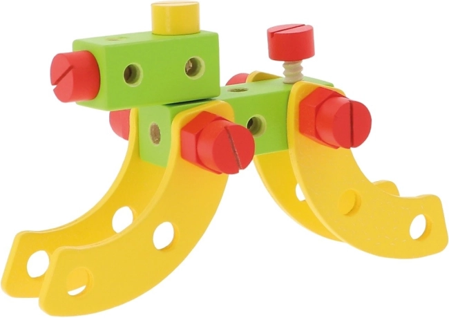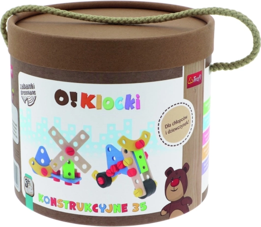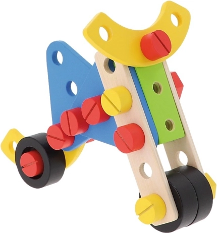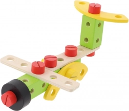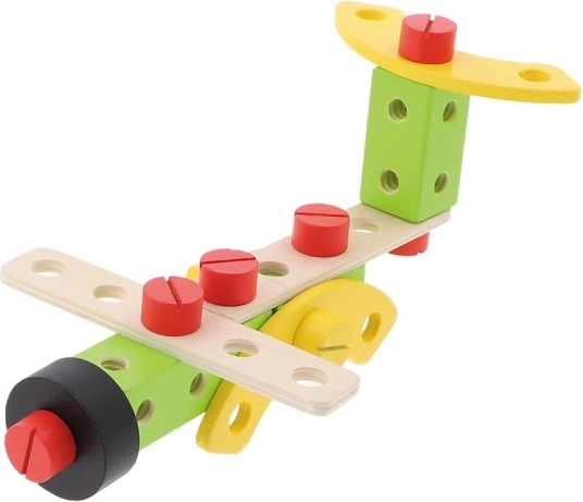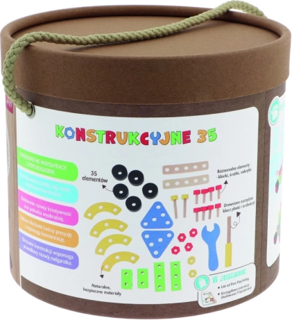 W zestawie znajduje się 35 elementów: klocki, śrubki oraz narzędzia, a także instrukcja z propozycjami zbudowania najróżniejszych konstrukcji.