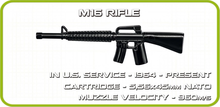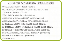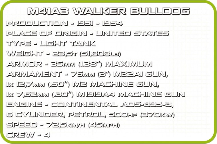 W zestawie znajdują się 2 szczegółowe figurki amerykańskich żołnierzy z akcesoriami oraz tabliczka z nazwą M41A3 Walker Bulldog do efektownej ekspozycji modelu.
