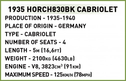Ten realistyczny zestaw przedstawia skróconą wersję legendarnego samochodu HORCH 830BK, znanego z jakości i innowacji technicznych. Specjalnie zaprojektowane elementy do modeli pojazdów zapewniają wierne proporcje i wiele zaskakujących detali. Trwałe nadruki zamiast naklejek nadają modelowi doskonały wygląd i odporność podczas zabawy.