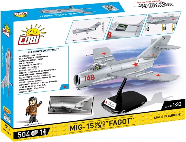 Zbuduj legendarny radziecki odrzutowy myśliwiec MiG-15 FAGOT w skali 1:32 z 504 elementów. Model oferuje otwieraną kabinę, ruchome koła, szczegółowe nadruki bez naklejek oraz prezentacyjną podstawkę z tabliczką. Idealne dla fanów lotnictwa, militariów i historii wojny koreańskiej.