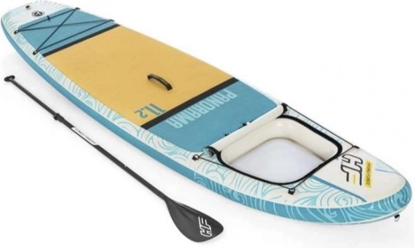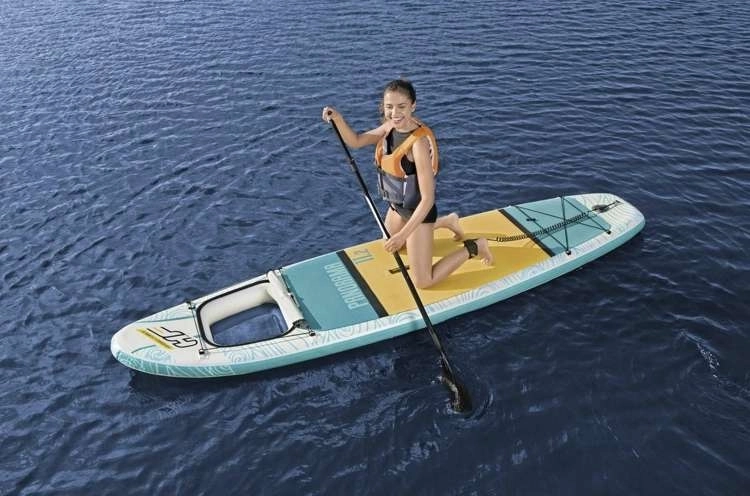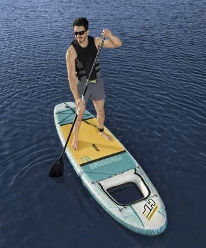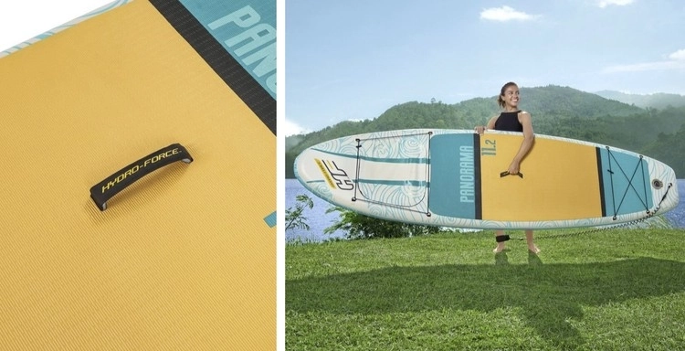 Paddleboard HYDRO-FORCE z panoramicznym okienkiem oferuje wyjątkowe doznania: przez wizjer możesz zaglądać pod powierzchnię i obserwować ryby oraz rośliny wodne. Uniwersalny allround kształt o wymiarach 340 × 89 × 15 cm gwarantuje stabilność dla początkujących i zaawansowanych oraz komfortową jazdę na spokojnej wodzie i w mniejszych falach.