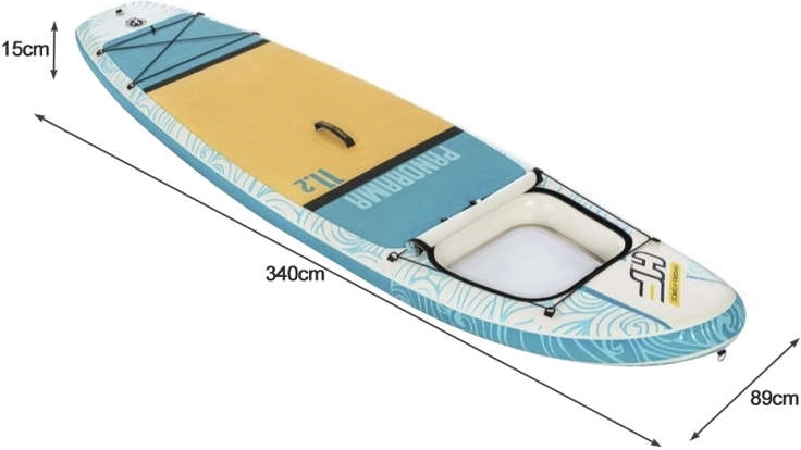 Wymiary 340 × 89 × 15 cm, materiał Drop Stitch oraz antypoślizgowa mata zapewniają wysoką sztywność, komfort i bezpieczeństwo do 150 kg.