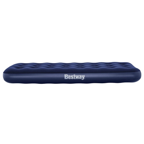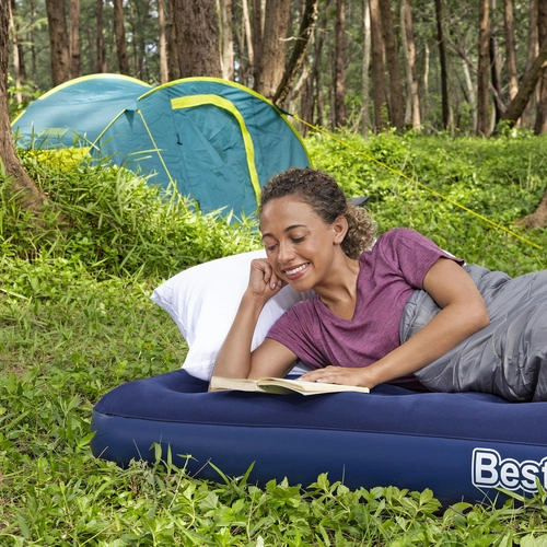 Praktyczny nadmuchiwany materac dla jednej osoby o wymiarach 185 × 76 × 22 cm marki BESTWAY jest idealny do domu i w podróż. Ma przyjemną w dotyku welurową powierzchnię, wytrzymałą konstrukcję coil-beam, zawór bezpieczeństwa ułatwiający pompowanie i spuszczanie powietrza, a w zestawie znajduje się także samoprzylepna łatka.
