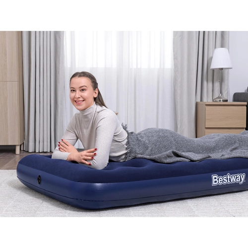 Praktyczny nadmuchiwany materac dla jednej osoby marki BESTWAY jest idealny na kemping, do namiotu oraz jako wygodne łóżko dla gości. Wytrzymałe PVC z miękką welurową powierzchnią zapewnia komfort i długą żywotność, a faliste/coil-beam komory gwarantują stabilność i podparcie. Dzięki szybkozrzutowemu zaworowi z blokadą materac szybko napompujesz i spuścisz powietrze, a także łatwo wyczyścisz.