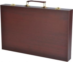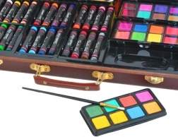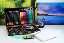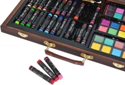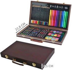 Wszystkie przybory plastyczne są schludnie ułożone w rozkładanej drewnianej walizce z przegródkami, dzięki czemu zawsze masz szybki i łatwy dostęp do wszystkiego, czego potrzebujesz.