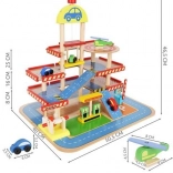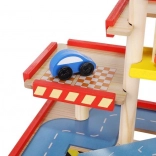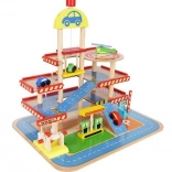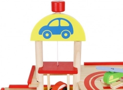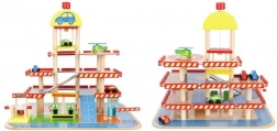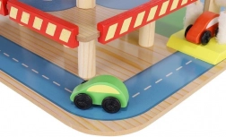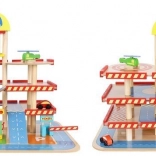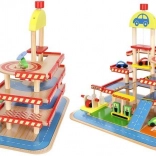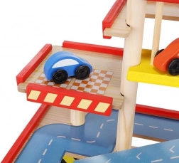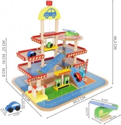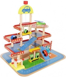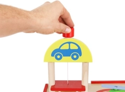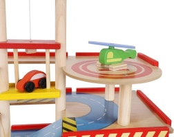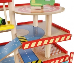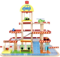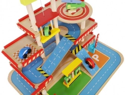 Kolorowy drewniany parking wielopoziomowy zapewni dzieciom godziny zabawy, rozwijając jednocześnie małą motorykę i wyobraźnię. W zestawie znajdują się myjnia, stacja paliw, kasa, winda, lądowisko dla helikoptera oraz pojazdy. Stabilna konstrukcja z bezpiecznego drewna i realistyczne dodatki wspierają twórczą zabawę oraz naukę zasad ruchu drogowego.