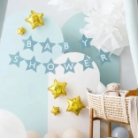Dodaj swojej imprezie z okazji narodzin maluszka subtelny akcent dzięki dekoracyjnemu banerowi w kształcie gwiazdek. Napis „Baby Shower” w pastelowym niebieskim kolorze to świetny wybór do spójnej, tematycznej aranżacji. Baner jest lekki, papierowy i gotowy do szybkiego zawieszenia.
