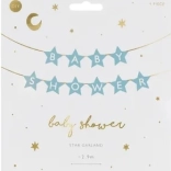 Stylowy baner na baby shower z motywem gwiazdek i napisem „Baby Shower” w delikatnym jasnoniebieskim kolorze. Idealny do dekoracji dla przyszłej mamy, łatwy do zawieszenia i tworzy natychmiastową, uroczystą atmosferę. Długość sznurka ok. 3 m, wymiary baneru 290 × 16,5 cm.