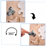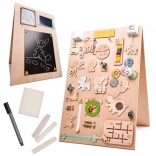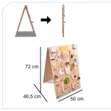 Unikalną cechą tej tablicy jest jej dwustronność - jedna strona zawiera wiele manipulacyjnych elementów, a druga służy jako powierzchnia do rysowania i pisania za pomocą kredy, markerów lub ołówków. To pomaga dzieciom rozwijać kreatywność i motorykę małą.