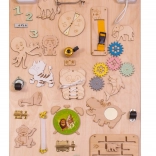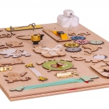 Tablica zawiera kolorowe koła zębate, dzwonki, zamki i inne interaktywne elementy, które wspierają rozwój motoryki małej.