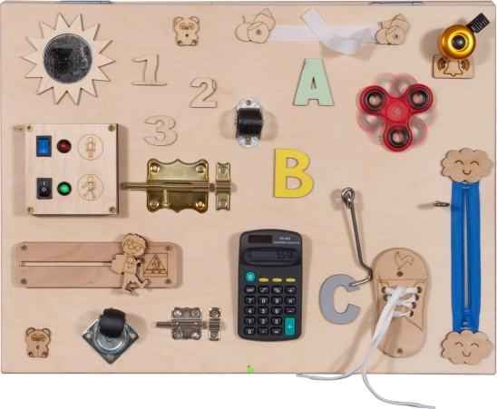 Zawiera różne elementy jak zamki, karuzela i kalkulator, które rozwijają małą motorykę i zdolności poznawcze.