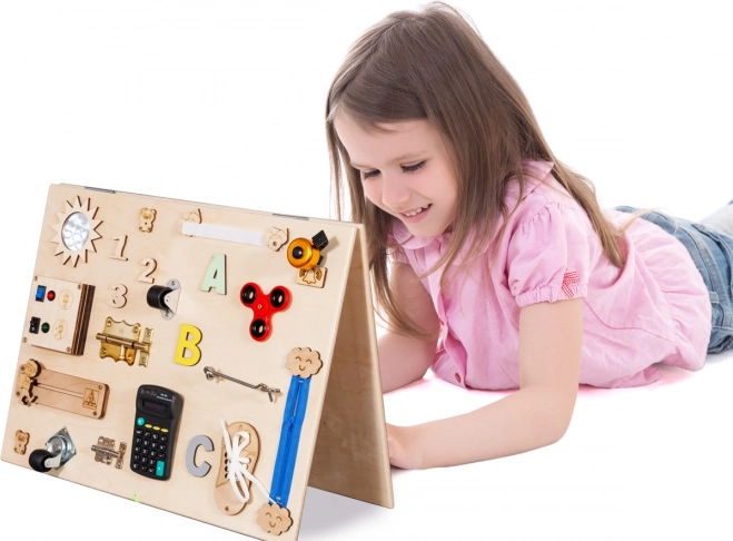 Interaktywne elementy nie tylko stymulują zręczność, ale także zdolność logicznego myślenia Waszego dziecka. Dwustronna konstrukcja pozwala na elastyczność w umiejscowieniu na stole czy podłodze, a drewniana produkcja gwarantuje długą żywotność.