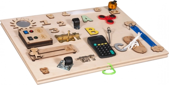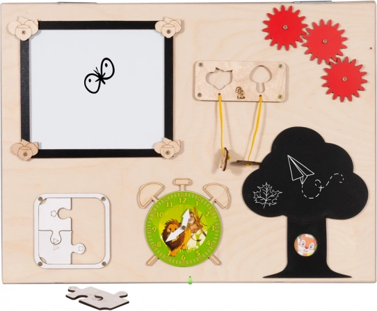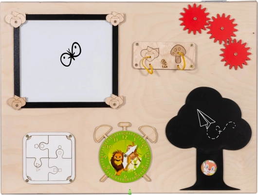 Ta drewniana manipulacyjna tablica jest pełna różnorodnych elementów do zabawy, które pomagają dzieciom rozwijać ich umiejętności. Dzieci mogą bawić się różnymi interaktywnymi mechanizmami, które zapewnią rozrywkę na długie godziny.