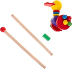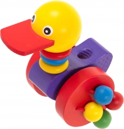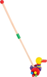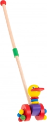 Wesoła drewniana kaczka z kijem, który dzieci mogą prowadzić. Jest to świetna zabawka dla dzieci, które uczą się chodzić, motywuje do rozwoju chodu.