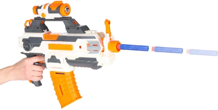 Zabawa piankowymi blasterami rozwija pracę zespołową, koordynację oraz motorykę palców podczas ładowania magazynków. Duże opakowanie prezentowe cieszy już przy rozpakowywaniu – świetna zabawa dla dzieci od 6 lat i dorosłych.