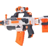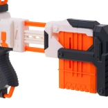 Modułowy blaster 4w1 to duża i solidna zabawka do dynamicznej zabawy zespołowej na zewnątrz i w domu. Dzięki licznym szynom taktycznym u góry i po bokach łatwo zamocujesz akcesoria, wyważysz zestaw i zyskasz większą kontrolę nad precyzją. Przesuwane okienko wyrzutowe pomoże przy ewentualnym zacięciu strzałki, a składana muszka poprawi celowanie.