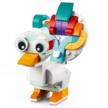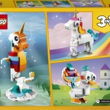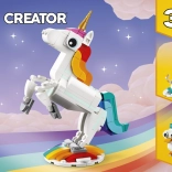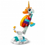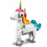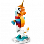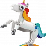 Dzięki temu czarującemu zestawowi dzieci zbudują urokliwego jednorożca ze złotym rogiem, tęczowym ogonem i ruchomymi nogami oraz kopytami. Model można wyeksponować na tęczowej podstawce i ustawić w tradycyjnej pozie na dwóch tylnych nogach albo postawić na wszystkich czterech.