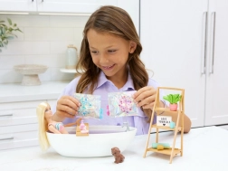 Ten zestaw kąpielowy zapewnia dzieciom od 3 lat kolorową, pachnącą i kojącą zabawę. Lalka Barbie w stroju kąpielowym z przezroczystym pareo ma 7 punktów zgięcia dla naturalnego pozowania. Dwie zamykane saszetki konfetti w kolorze różowym i niebieskim odmienią wodę w wannie, a po zmieszaniu stworzą fioletową kąpiel.