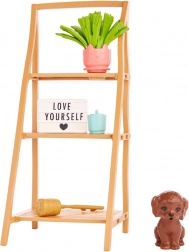 W zestawie znajduje się wolnostojąca wanna z odkładaną tacką, półka w wyglądzie drewna oraz mnóstwo dodatków: duża i mała szczotka, buteleczka z balsamem, mydło, świeczka, roślinka, dekoracyjny napis oraz urocze szczenię. Półka i tacka mają praktyczne uchwyty, aby akcesoria pozostawały na swoim miejscu podczas zabawy.