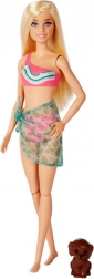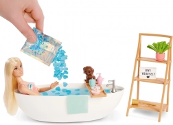 Barbie z 7 punktami zgięcia w kolorowym stroju kąpielowym i pareo może wygodnie relaksować się w wannie. Nie brakuje też szczeniaka do dalszych opowieści.