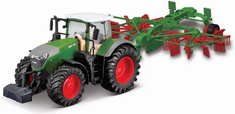 Model ciągnika rolniczego Bburago Farm Traktor Fendt 1050 Vario ze zgrabiarką (przetrząsaczem zielonki), wykonany z metalowych i plastikowych części, powstał na podstawie pierwowzoru ciągnika będącego topową serią 1000 Vario.