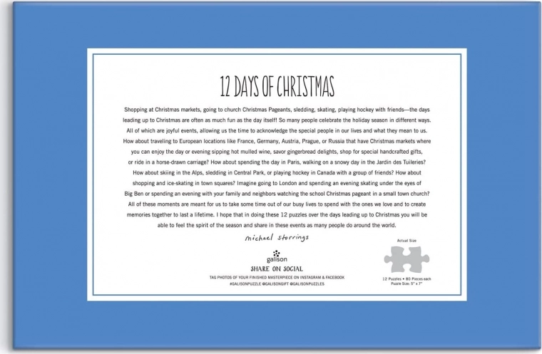 Wszystkie puzzle mają ten sam format o wymiarach ok. 12,7 × 17,8 cm i składają się z 80 elementów – idealna długość zabawy na codzienny świąteczny rytuał. W zestawie znajduje się również dwustronna podkładka ze wszystkimi 12 motywami, ułatwiająca układanie.