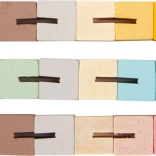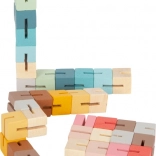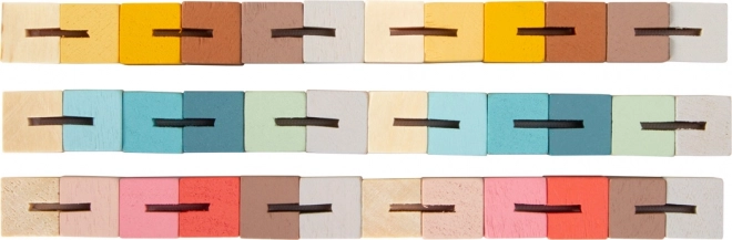 Drewno jest zabarwione modnymi pastelowymi odcieniami, co nadaje zabawce nowoczesny wygląd.