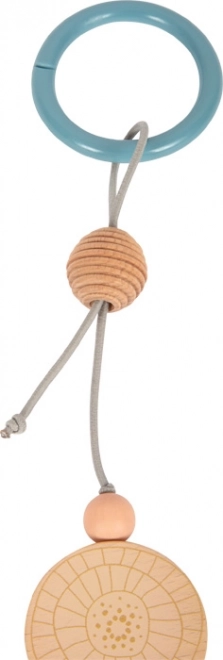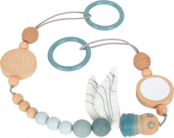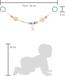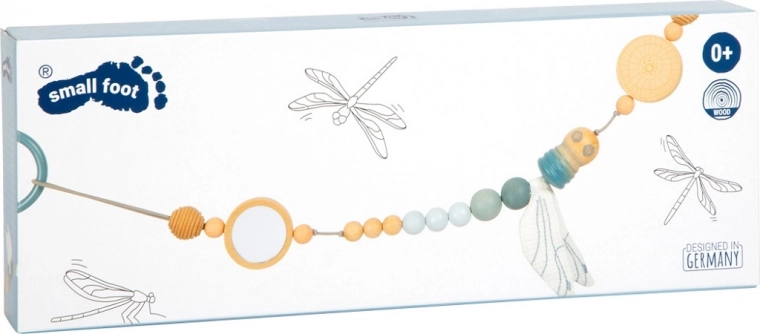 Ten designerski łańcuszek do wózka SMALL FOOT w naturalnym stylu zachwyca połączeniem drewnianych koralików o różnych rozmiarach, delikatnych pastelowych odcieni i tekstylnych elementów. Dzięki elastycznemu sznurkowi dopasowuje się do różnych typów wózków i pałąków, a zatrzaskowe punkty na kółkach mocujących utrzymują go pewnie na miejscu. Materiałowa ważka z szeleszczącymi skrzydełkami wspiera zmysły i małą motorykę maluszka.