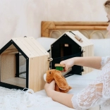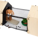 Ta przemyślana królikarnia z wysokiej jakości drewna oferuje dwie oddzielne budki – jedną do spokojnego snu i drugą z okienkiem z siatki do obserwowania otoczenia. Do budek łatwo dołączysz panele ogrodzeniowe z siatki, tworząc zewnętrzny wybieg dla jeszcze bardziej angażującej zabawy. Tylną czarną tablicę można opisywać kredą, co daje dodatkową porcję twórczej interakcji.