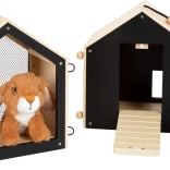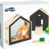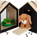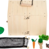 Pluszowy królik, drewniana królikarnia (2 budki), 2 panele ogrodzeniowe z siatki, zmiotka, miska, drewniana marchewka, listek sałaty, filcowe bobki