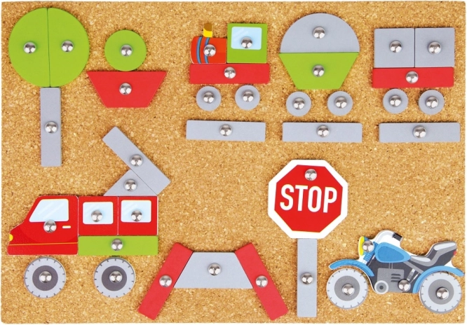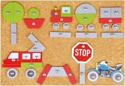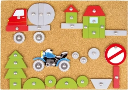 Ta zabawna i edukacyjna gra do wbijania jest idealna dla małych twórców. Dzieci mogą projektować własne środki transportu i przybijać je do korkowej tablicy za pomocą młoteczka i gwoździków. Kolorowe i zadrukowane elementy oferują niezliczone kombinacje i wspierają wyobraźnię.