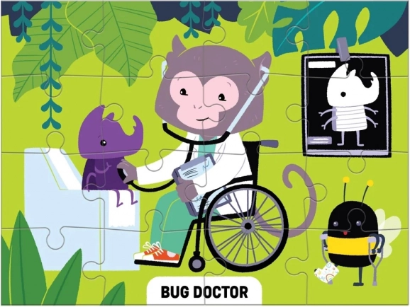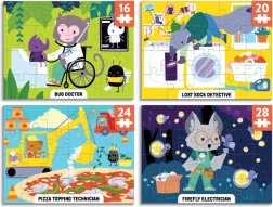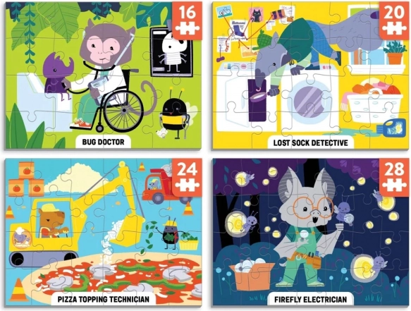 Odkryj cztery zabawne układanki w jednym opakowaniu! Zestaw Mudpuppy Level Up! oferuje puzzle o różnym poziomie trudności (16, 20, 24 i 28 elementów), które prezentują dzieciom kreatywne i zabawne zawody – od elektryka świetlików po doktora chrząszczy. Puzzle są wykonane z materiałów z recyklingu, mają matową powierzchnię dla wiernych kolorów i są zapakowane w solidne pudełko, idealne do wielokrotnego użytku oraz jako oryginalny prezent.