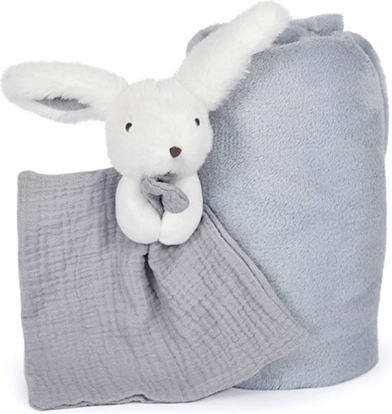 Pluszowy króliczek i kocyk są wykonane z przyjemnego materiału, idealnego dla wrażliwej skóry dziecka.