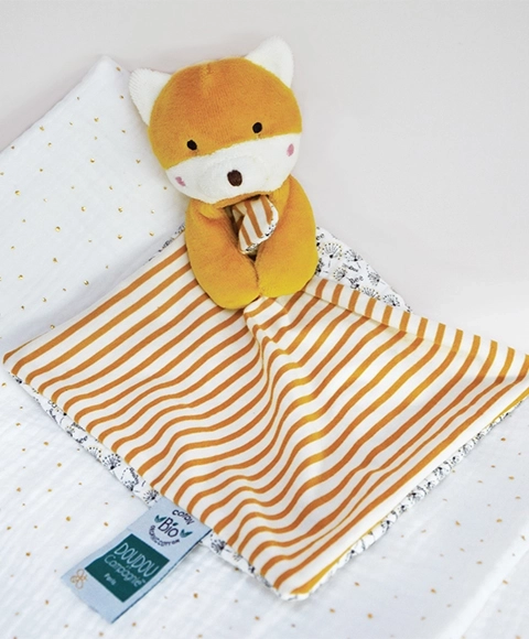 Ten miękki lisek z przytulanką został zaprojektowany w harmonijnych, inspirowanych naturą kolorach, aby przynieść maluszkowi poczucie spokoju i bezpieczeństwa. Organiczne materiały przyjazne skórze wspierają rozwój zmysłów, a delikatna faktura koi i towarzyszy dziecku podczas snu i odpoczynku.