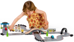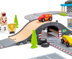 Zestaw 47-częściowy obejmuje samochody wyścigowe, podium dla zwycięzców, wiadukt i inne.
