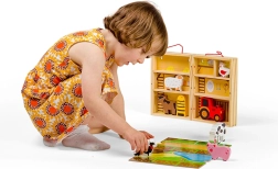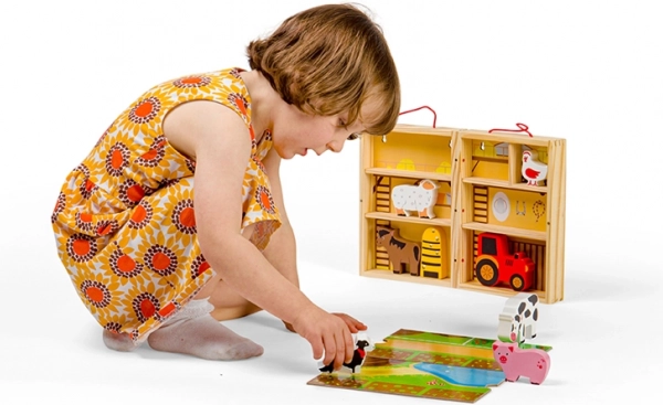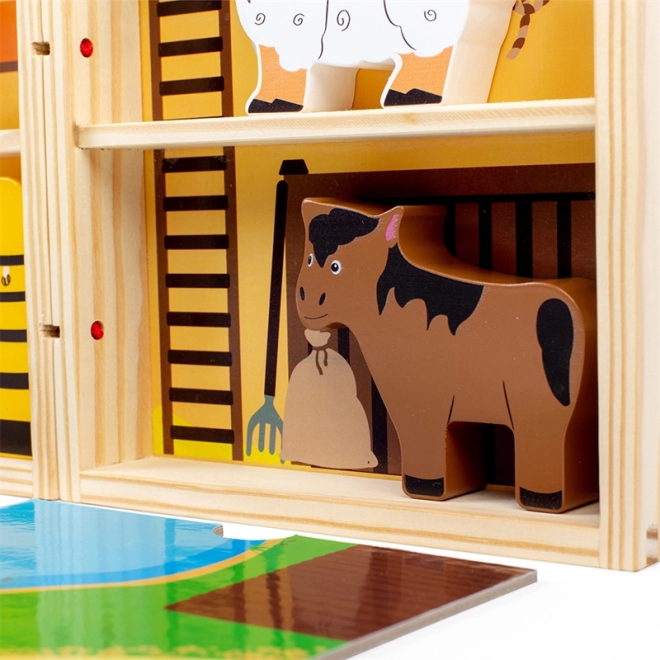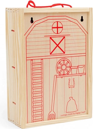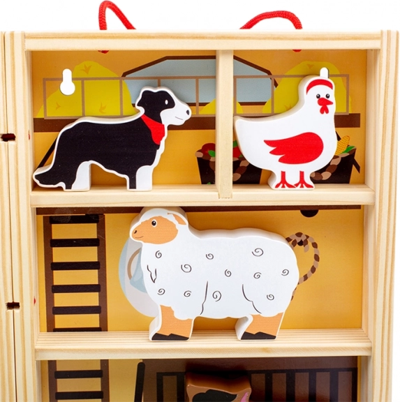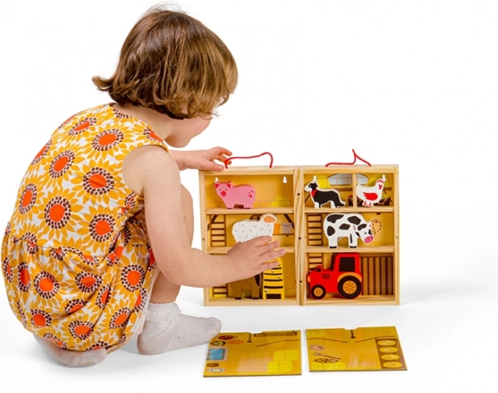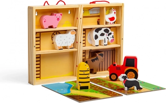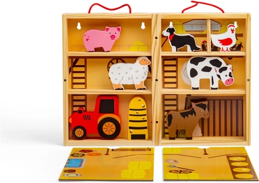 Ta stylowa drewniana farma w mgnieniu oka rozkłada się w kompletną scenę do zabawy, a po grze wszystko łatwo odkłada się z powrotem do pudełka. Idealna w podróży – kompaktowa, wytrzymała i gotowa do zabawy zawsze i wszędzie. Wysokiej jakości lite drewno i gładkie krawędzie zapewniają bezpieczną zabawę dla najmłodszych.